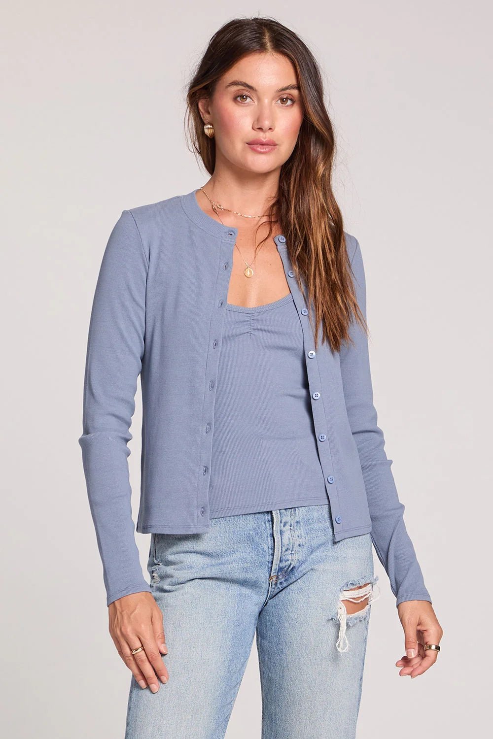 In a soft, approachable worn blue, this cardigan pairs beautifully with the matching Slim Tank for a coordinated ensemble, or layers effortlessly over dresses, tees, and everything in between.
