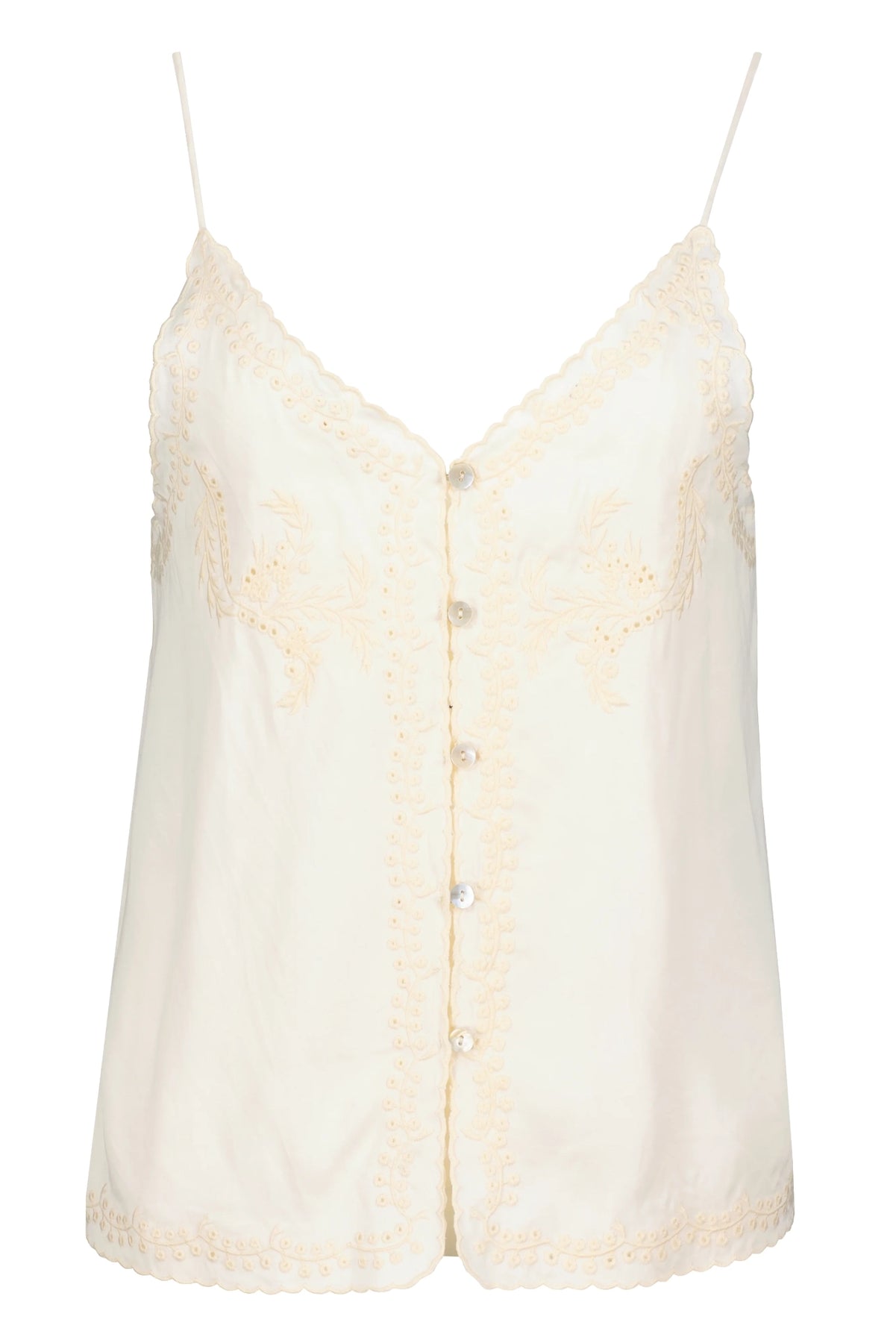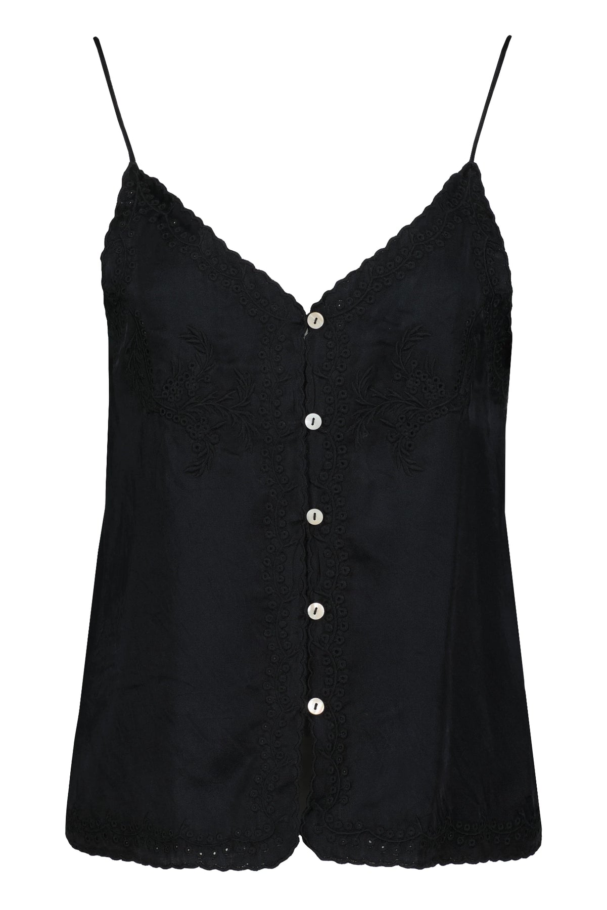 Meet the Anya Button Front Embroidered Cami, a soft ivory silhouette traced with delicate tonal embroidery and scalloped edging, finished with luminous buttons for a touch of vintage romance. Style it tucked into tailored trousers for a polished look, or pair with relaxed denim and leather slides. 100% Viscose