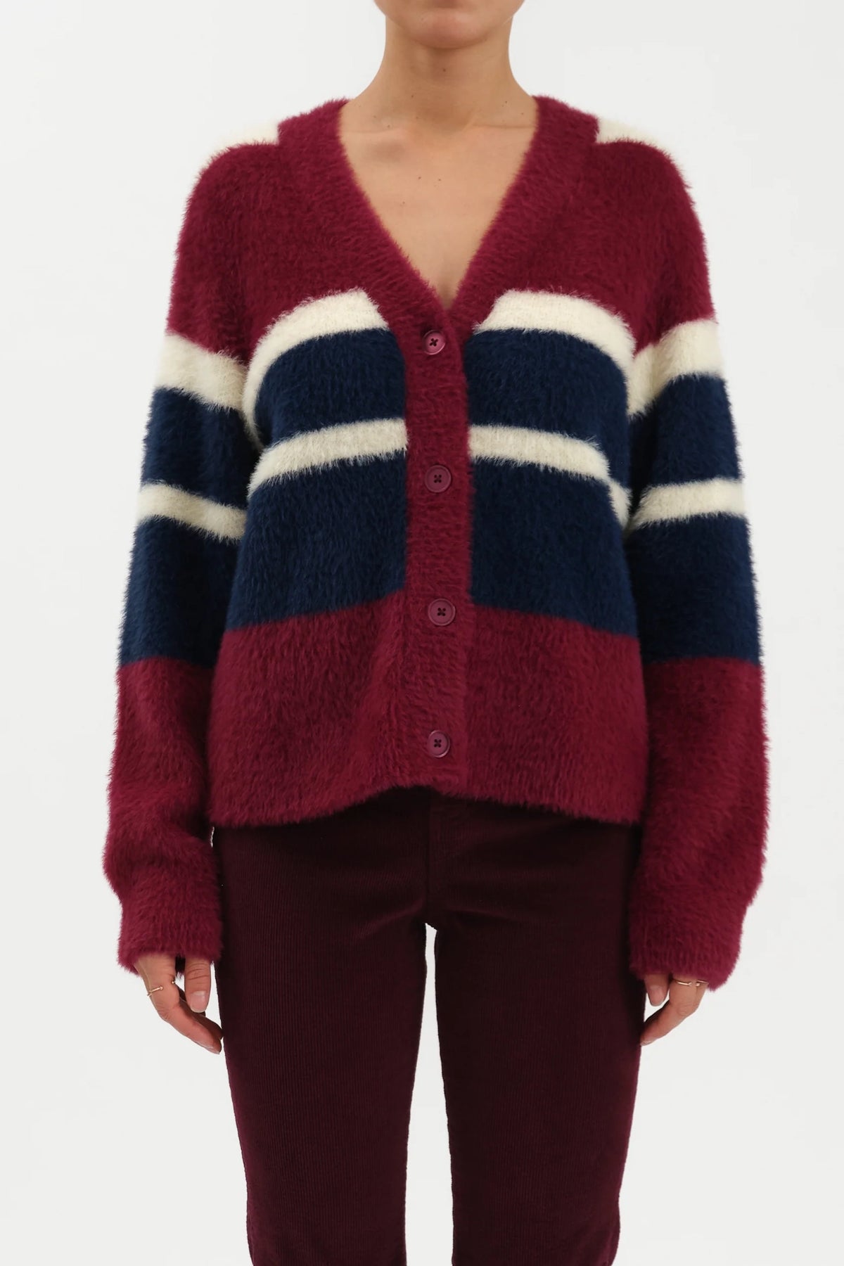 Cute oversized fuzzy cardigan with V neck button front and stripe detail.